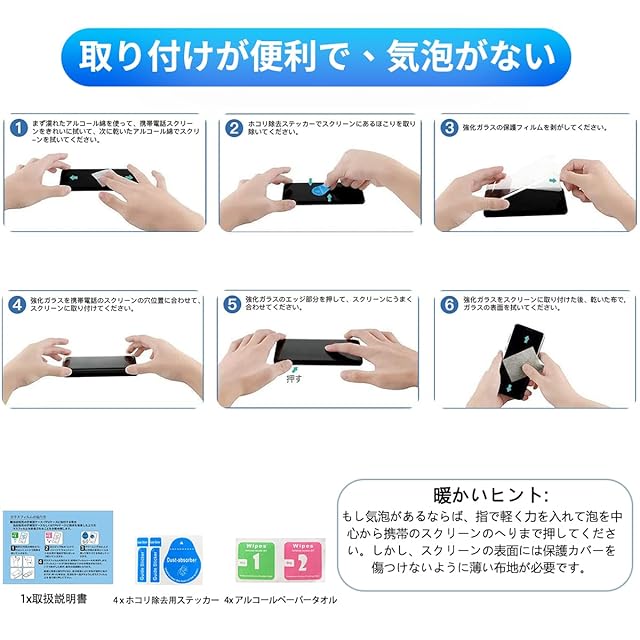 【 貼り付けやすい 】弊社のガラスフィルムは自動吸着式強化フィルムなので、気泡が入りにくいです、仮に気泡が出てきたとしても、ちょっとした作業で消えてしまいます!強化フィルムをガラスフィルムの画面に置いて、シリコンを利用して自動的に吸着します。なので、手先が苦手な人でも簡単に取り付けられますよ!(お問い合わせ先:「カスタマーサービス」に入り、「注文履歴」-「出品者」カスタマーサービスへご質問ください。私たちはお客様にご満足いただけるよう最善を尽くします。)