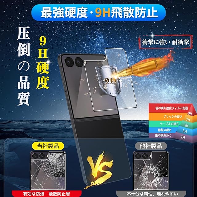 <b>対応 Galaxy Z Flip7 ガラスフィルム(2枚入り)+ 用 ギャラクシー z flip7 カメラフィルム(2枚入り):</b> <br>用 Z Flip7 フィルム<br>日本製AGCの航空宇宙用途に特化したガラス材料(Dragontrail)を採用、表面硬度が9Hを超え、鉱石の硬さを示すビッカーズ硬度Hv673を実現。<br>極限の衝撃、圧力、摩擦を特徴とする環境においても高い保護力と卓越した耐久性を発揮、新たな業界ベンチマークとなりました。(大切な携帯電話の液晶画面を保護し、衝撃や表面のキズを防止します!)<br><b>【撥水撥油・指紋防止】:</b>極薄ガラス採用,見た目・触り心地ともに何も付けてない状態と殆ど変わりません。指紋付着防止,高耐久性防汚コートにより指紋や汚れが付きにくくなっています。付着しても簡単に拭き取れます。真空蒸着技術を利用し、保護フィルム全面に指紋防止薄膜を形成することで、従来品より汚れ防止効果はより長く持続でき。<br><b>【高透過率 高タッチ感度】:</b>用 Galaxy Z Flip7 ガラスフィルム高いの光透過率で、高精細画面の美しさはそのまま、写真などを綺麗に映すことができま す。見た目・触り心地ともに何も付けてない状態と殆ど変わりません。スムーズな使い心地を味わうことができます。<br><b>【貼り付けやすい】:</b>自己吸着層で気泡も浮きもなく、たった5秒で画面に溶け込んでいくように完璧に貼れます。<br>①スマホ電源をオフにし、保護フィルムとクリーニングクロスなどを取り出してください。<br>②「グリーン」のウェットティッシュで液晶画面を拭いてきれいにしてください。<br>③「ピンク」のクリーニングクロスで液晶画面を拭いてきれいにしてください。<br>④「ブルー」のクリーナーでほこりなどを除去してください。<br>⑤保護フィルムの裏面の保護シートを剥がしてください。保護フィルムを液晶画面に合わせて軽く置いてください。<br>⑥保護フィルムを置いた後、指でゆっくりと液晶画面の最初から最後までスライドします。保護フィルムは自動的に端に吸着しますので、少々お待ちください。<br>⑦残った気泡をクリーニングクロスで、フィルムの外側に向かって指で押し出すようにして取り除きます。<br>⑧貼り付けが完了。クリーニングクロスで液晶画面をよく拭いてください。<br><ヒント>◆少量の気泡/接着剤が残る場合、クリーニングクロスを使って、その位置で繰り返して拭きながら画面を押して、取り除くことができます。◆広い範囲の気泡が残っている場合は、ガラスフィルムを軽く持ち上げて、気泡をガラスフィルムの外まで押し出してから、再吸着してください。<br><b>パッケージ内容:</b>·2×強化ガラス保護フィルム 2×カメラフィルム 1x取扱説明書