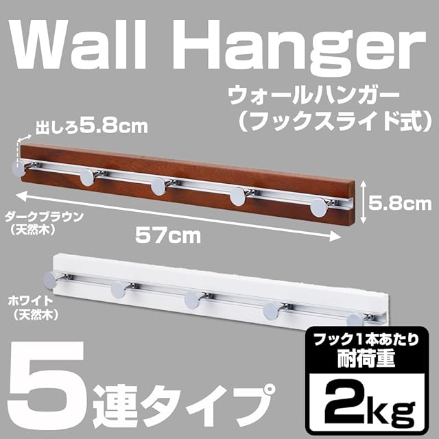 商品名:[ドウシシャ] 壁掛け ウォールハンガー スライド式 5連 畳めるフック ダークブラウン 幅57×奥行5.8×高さ5.8cm HKM-S5DBR