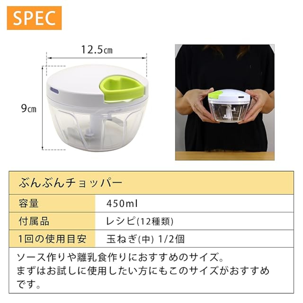 サイズ:約12.5×12.5×9cm / 満水容量:約450ml / 重量 :約200g / 1回の使用目安:玉ねぎ(中) 1/2個