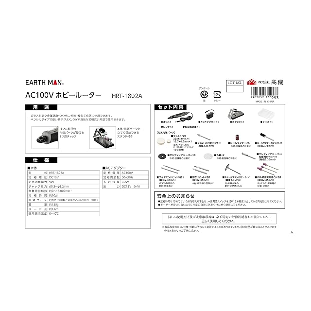 商品名:高儀(Takagi) EARTH MAN ホビールーター ミニルーター リューター スタンド付 ペン型 工具 ビット バフ 砥石 セット 彫刻 金属 研磨 切断 模型 工作 コンセントタイプ 無段階スピードコントロール 3つ爪チャック グレー×ブラック HRT-1802A
