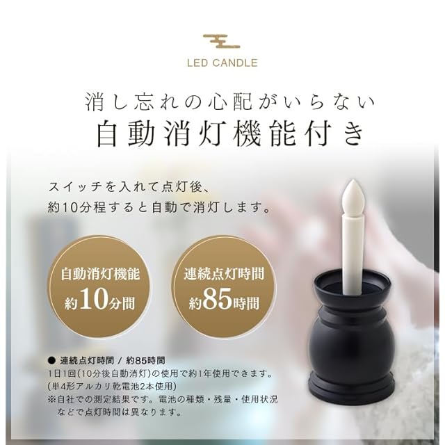 【LEDローソク】商品サイズ/(約)4.8×4.8×高さ12.1cm、電源/単4形アルカリ乾電池 2本使用(別売)、光源/LED、材質/ABS樹脂・ステンレス・アクリル樹脂、連続点灯時間/(約)85時間:1日1回(10分後自動消灯)の使用で約1年使用できます。(単4形アルカリ乾電池 2本使用)※自社での測定結果です。電池の種類・残量・使用状況などで点灯時間は異なります。