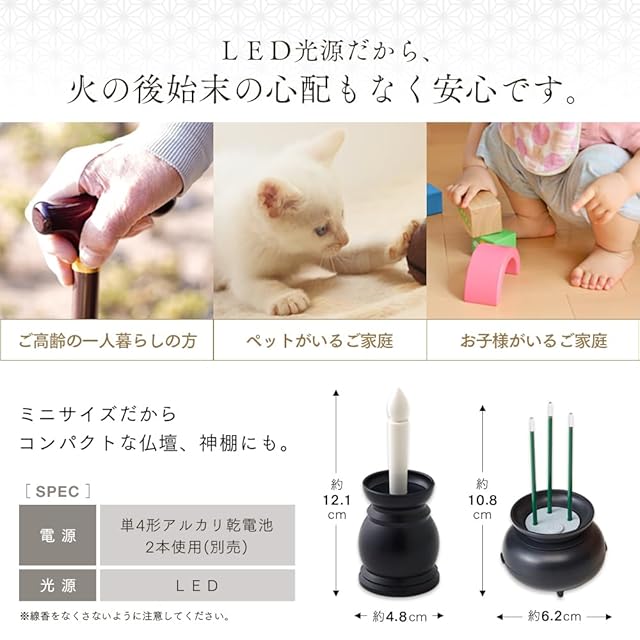 商品内容:【LEDローソク】4.8×4.8×12.1cm【LED線香】6.2×6×10.8cm