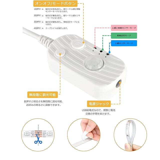 高演色2835 SMDチップを300個を搭載ており、明るく、鮮やかな電球色再現が可能なテープLEDです。DIYモードと点灯モードがあるのため、お好きによって、光の明るさが調整でき、場合に応じてふさわしい明るさを調整して屋内と屋外の照明に非常に適しています。 三段階調光タイプ 人感&明暗センサー付き 使用環境:屋内&屋外 「無段階調光」 調光機能については、矢のマーク付きのボタンを長押すと明るさを無段階に調光可能、シーンや用途に合わせてお好みの明るさに調整できます。 「間接照明」 屋内、キッチン、リビングやダイニング、寝室などのお部屋の間接照明。テープカットで長さを自由に調整することができるので、お部屋や家具の大きさに合わせて思い通りの照明をつくることができます。目にも優しい。 取り付け方法: 1、ご使用の前に取り付ける場所のほこりを拭き取してください。 2、お好きな場所に貼り付けます。 3、カット可能で、自分の必要によってテープライトの長さ調整できます。 取り外し方法: ヘアドライヤーの温風を6分ぐらい当て、簡単に取り外すことができます。家具を傷めたり、壊すことはありません。 商品情報 長さ:5m 防水 LEDタイプ:SMD2835チップ 定格電圧:5V 消費電力:6W/m ルーメン:24lm/m 色:電球色2500K タイプ:三段階調光タイプ 人感&明暗センサー付き USB充電器対応:2A/5V以上 ※出力電流2A/5V以上の充電器で接続することをお勧めします。出力電流2A/5V以下の充電器を使用すれば、電流不足で光が弱くなるかもしれません。 「三つモード」 ①月モード/人感と明暗センサーモード:電源ボタンを1回押すと指示灯が赤色点灯し、ランプは月モード/人感と明暗センサーになります。このモードは夜にだけ人の動きを感知すると自動で点灯します。人が離れると20秒後に自動で消灯します。 ②太陽モード/人感センサーモード:電源ボタンを2回押すと指示灯が青色点灯し、ランプは人感センサーモードになります。このモードは昼間や夜にかかわらず人の動きを感知すると自動で点灯します。人が離れると20秒後に自動で消灯します。 ③常時点灯モード:電源ボタンを3回押すと指示灯が緑色点灯し、ランプは常時点灯モードになります。 *4回押す:テープライトは消灯します。 「IP65防水仕様」 IP65防水仕様で屋内での使用、そして屋外使用で雨や雪が降っても使用いただけます。 LEDテープライト上にジェルをポッティング保護をしたジェル防水タイプですが、水中でのご使用はできません。(ご注意:アダプタは防水機能がありません。) 「低消費電力・省エネ」 1メートル当たり6W、一般照明より省エネ、発熱量も少なく、節電効果が抜群!環境にも優しい家庭用ledライトです。 (ご注意:切断したら、残った部分を再利用する場合2ピンの2835SMD対応のコネクタで延長必要です。) 「簡単設置」 強力粘着両面テープ付きでお好きな場所に貼り付けます。細長いの形で、またテープライトをより安定させるためにコードクリップが付属され、狭いところに貼り付けるので、お好きなところを思う通りに設置できます。