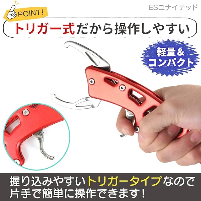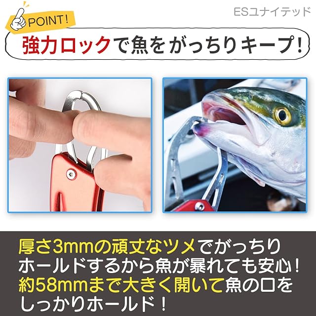 ・軽量で握り込みやすいトリガータイプなので片手で簡単に操作できます! <br>・強力ロックで魚をがっちりキープ!厚さ3mmの頑丈なツメでがっちりホールドするから魚が暴れても安心! <br>・約58mmまで大きく開いて魚の口をしっかりホールド! <br>・サビに強いステンレス製です。 <br>・スパイラルコードとカラビナが落下防止になります。