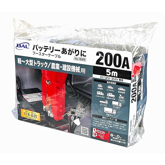 BAL(大橋産業) ブースターケーブル DC12V DC24V 200A 5m 軽自動車 普通乗用車 SUV 2t 4t 大型トラック 農業 建設機械 絶縁フルカバークリップ 取り付け手順タグ 品番:1685