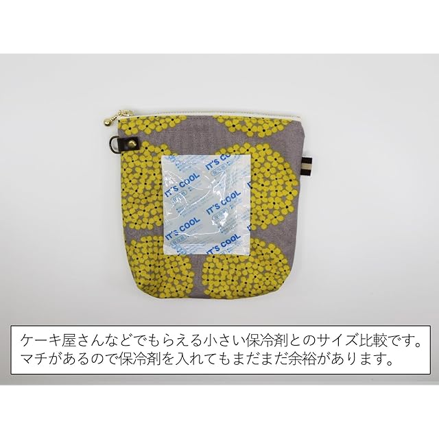 夏場はチョコや飴など溶けやすいお菓子と保冷剤を、冬場はおにぎりなどを入れて持ち運べるポーチです。保冷が必要な目薬やお薬などの持ち運びにも便利。サイドのDカンに持ち手をつけてバッグアクセサリーとしてもお使いいただけます。ケーキ屋さんなどでもらえる一般的な保冷剤が入るサイズで、マチがあるので見た目よりも収納力があります。
