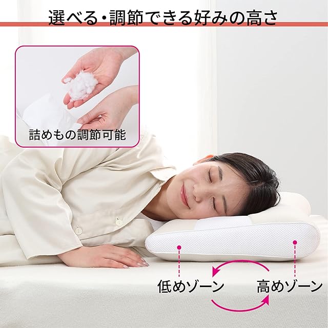 首・肩に沿うアーチ型形状と後頭部が収まりやすいくぼみ形状で頭にフィット。枕の使用向きを変えれば高め・低めが選べてお好みのフィット感でお休みいただけます。