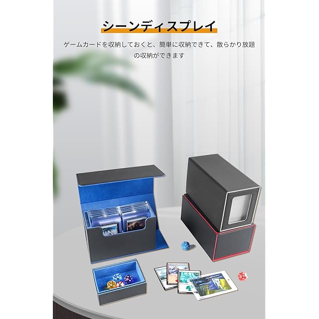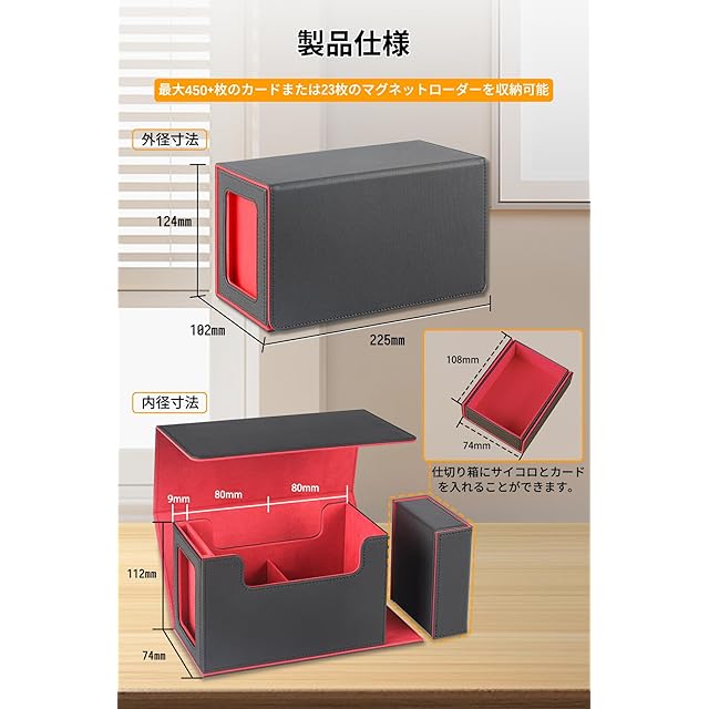 【製品仕様】デッキケース【外部サイズ】縦22.5cm 幅10.2cm 高さ12.4cm 【内部サイズ】縦0.9+8+8 cm 幅7.4 cm 高さ11.2 cm 【サイコロケースのサイズ】縦10.8 cm 幅7.4 cm 【材質】上質PUレザー 【重量】550 g 【収納枚数】最大450+枚のカードまたは23枚のマグネットローダーを収納可能、スリーブ付きのカードも簡単に入れることができる、市販されているほぼ全てのカードゲームに対応。 ・スタンダードサイズ63×88mm ・スモールサイズ59×86mm ・など様々なカードゲームに対応しております。
