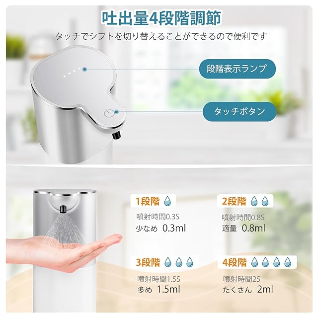 「四段階調節」4段階調節機能があり、自分に合った吐出量を選ぶことができる。スイッチを入れてタッチボタンに軽く触れ、ランプの数に応じて何段目かを確認します。各シフトの吐出量は0.3g、0.8g、1.5g、2.0gです。大人でも子供でも自分に合った吐出量を選ぶことができます。