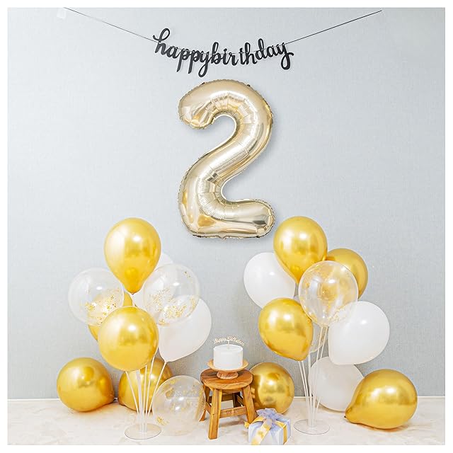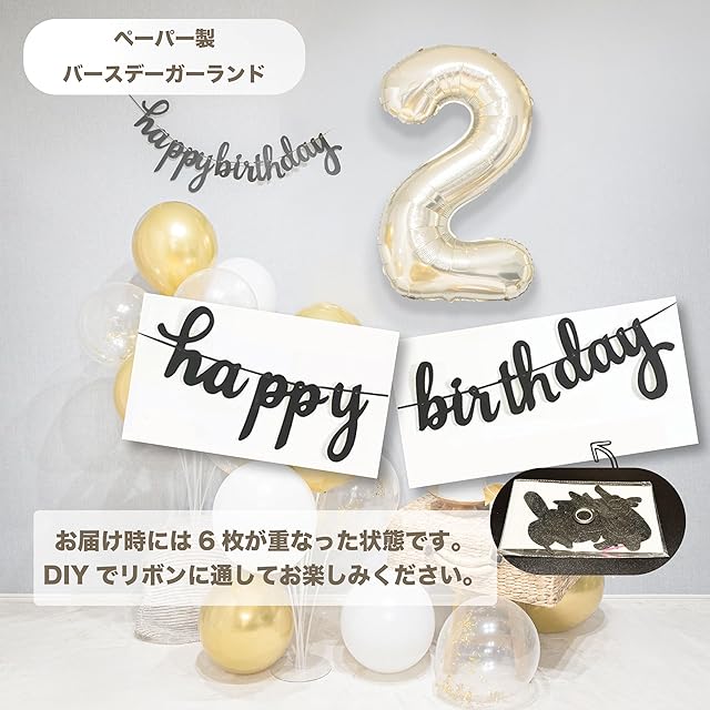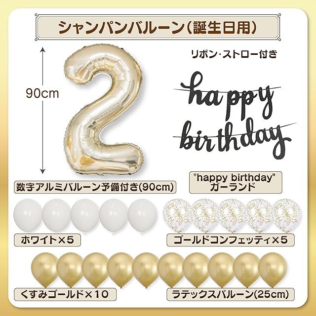 【内容】数字アルミバルーン2歳用 (90cm)、"happy birthday"ガーランド 、ホワイトラテックスバルーン5枚・くすみゴールドラテックスバルーン10枚・ゴールドコンフェッティラテックスバルーン5枚 合計20枚、ストロー・リボン・予備ナンバーバルーン付き ※スタンド、ケーキ、トランク等の小物はセットに含まれておりません。