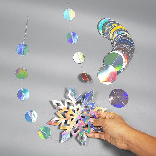 【商品内容】:雪の結晶ガーランド2本、丸形ガーランド1本、長さ:4メートル/本、総長さ約12m、素材:ペーパー、カラー:虹色、サイズ:詳細はサイズの畫像をご參照ください、