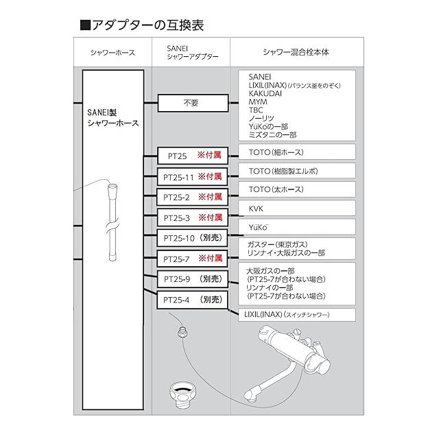 水栓側アダプター(5個),シャワーヘッド側アダプター(2個)付属。※一部別売りアダプターが必要なメーカーがございます。商品画像を参照ください。