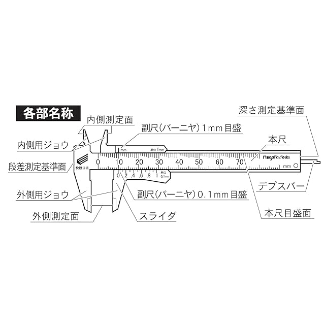 最大測定長:70mm、最小読取値:0.1mm・1mm、器差:±0.2mm