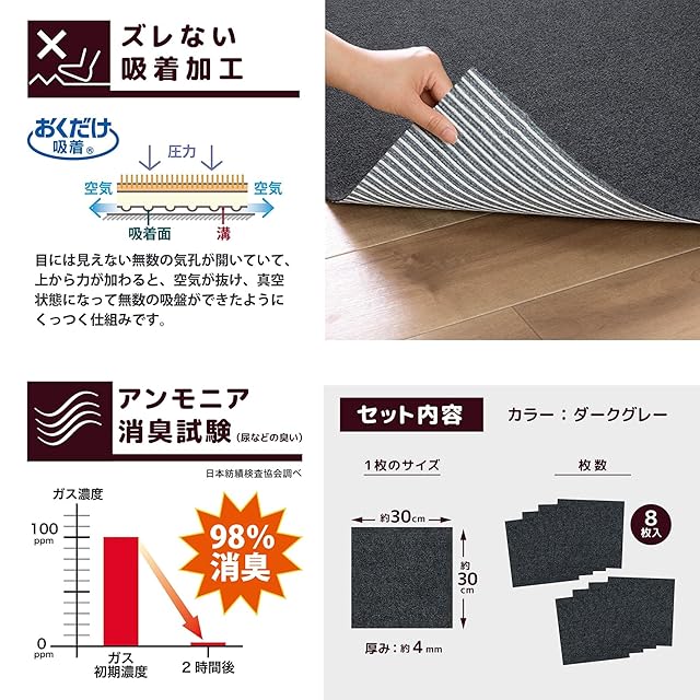 商品名:サンコー おくだけ吸着 獣医師推奨 ペット用撥水タイルマット 30cm×30cm 8枚入 ダークグレー 犬 猫 サンコー カーペット 【日本製 撥水 消臭 洗える ハサミでカット可】 KI-64