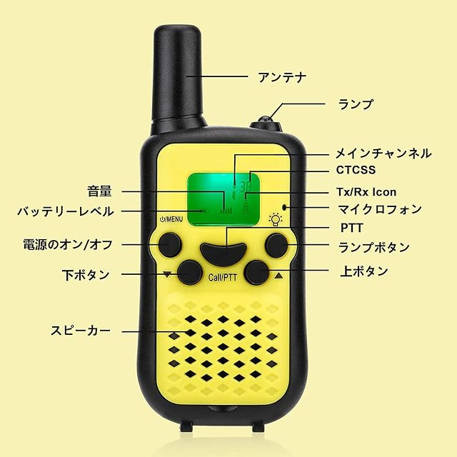 <p>【総務省技術基準適合商品・総務省の厳しい審査を合格した安心の技適マーク取得トランシーバー !】免許なしで誰でも使える特定小電力トランシーバー。</p><p>商品仕様</p><p>【送・受信周波数】422.050~422.300MHz(12.5KHzステップ)</p><p>【電波型式】F3E</p><p>【送信出力】10mW</p><p>【使用温度範囲】-20度~+50度</p><p>【電源】単4乾電池6本(別売)/ NiMHバッテリー(別売)</p><p>◆機能</p><p>通常通話(交互通話)</p><p>グループモード(38グループ設定可能)</p><p>トークビープ</p><p>視認性の高いバックライト付LCDディスプレイ採用</p><p>10種類の呼出音</p><p>バッテリーセーブ機能</p><p>弱い信号を受信するためのモニター機能</p><p>LED懐中電灯</p><p>【トランシーバー 2台セットの通信距離の目安】※ご利用環境によって異なります</p><p>市街地:約100m~200m</p><p>郊外:約500m~1km</p><p>見通しの良い場所:約1~2km</p><p>トランシーバー セット 安心の1年間メーカー有</p><p>初期不良ある場合はトランシーバー 子供 到着後1ヶ月以内なら使用済みでも可能!(手続きによる)</p><p>1年以内であれば無償修理・交換も可能です。</p><p>使い方:</p><p>1.電源を入れます:画面のライトが点灯するまで電源ボタンを押し続けます。</p><p>2.チャンネルを変更する:メニューを1回押し、上/下キーを使用して目的のチャンネルにスクロールします、2つのデバイスを同じチャネルにTALKキーで配置します。</p><p>3.ボリュームを調整する:8のプリセットボリュームがあります、上/下を押して音量を調整します。</p><p>付属:</p><p>トクテイショウデンリョクトランシーバー ニダイセット</p><p>説明書 1冊</p>ヒント:1. このトランシーバーにはイヤホンジャックがなく、キーをロックする機能もありません。2. このトランシーバーは防水ではないので乾燥的な環境に保管してください。