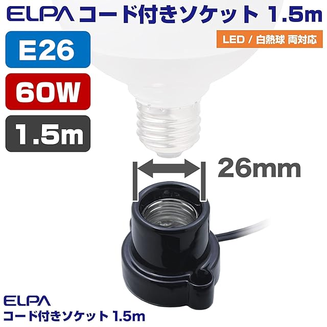 商品名:エルパ (ELPA) コード付ソケット (口金 E26 / 1.5m / ブラック) 中間スイッチ付 ( KP-M2615H(BK) )