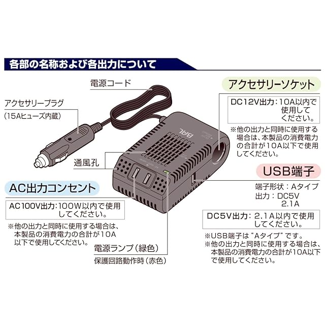 商品名:BAL(大橋産業) 3WAYインバーター DC12V車専用 定格出力:100W No.1741
