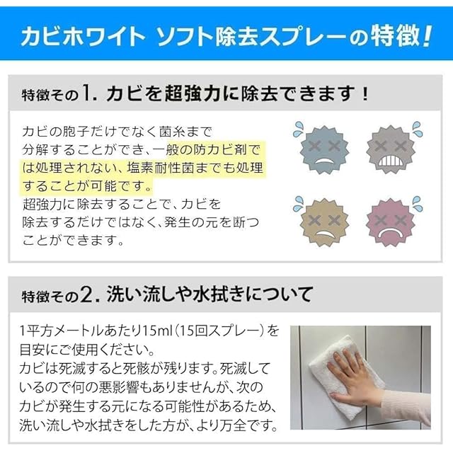 【あらゆるカビに対応】黒カビ 青カビ 赤カビ 緑カビ 白カビを強力除去します(衛生微生物研究所調べ)。頑固なカビには原液で、軽度なカビなら最大2倍まで希釈して使用できるので経済的です。
