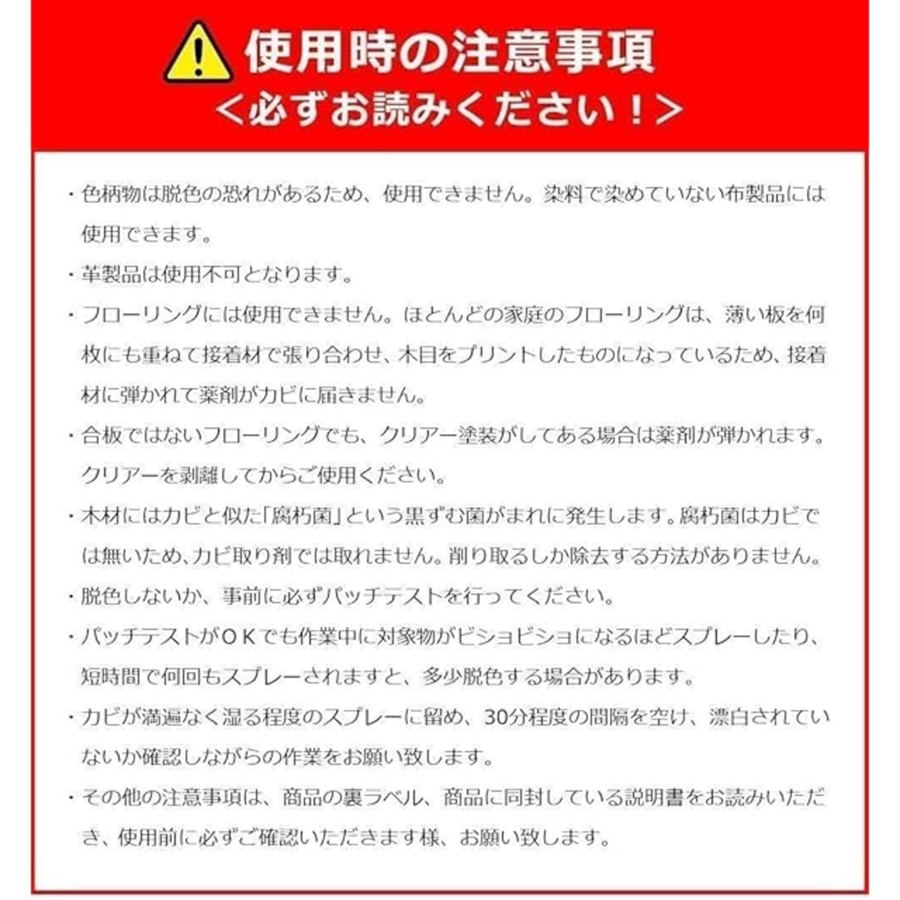 【本製品について】木材、畳、布などのカビ取り剤です。軽度のカビであれば最大2倍まで希釈しても除去できます。カビ取り後は乾燥すると成分が蒸発します。