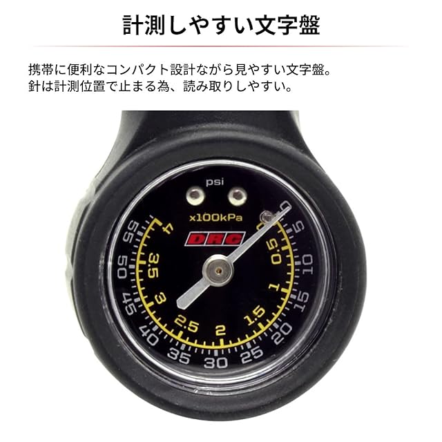 商品名:ディーアールシー(DRC) G101 エアゲージ スタンダードタイプ 測定範囲:0~400kPa(58psi) モーターサイクル/MTB専用エアゲージ 米式・仏式バルブ対応 測定時の針固定タイプ 簡単計測 減圧調整アジャストボタン ダートフリーク D9987(旧品番:D59-36-101)