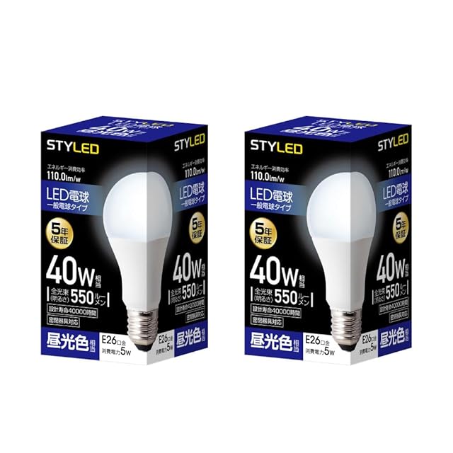 商品名:スタイルド LED電球 口金直径26mm 電球 40W形相当 昼光色 2個セット 一般電球 広配光タイプ 密閉器具対応 HA4T26D2