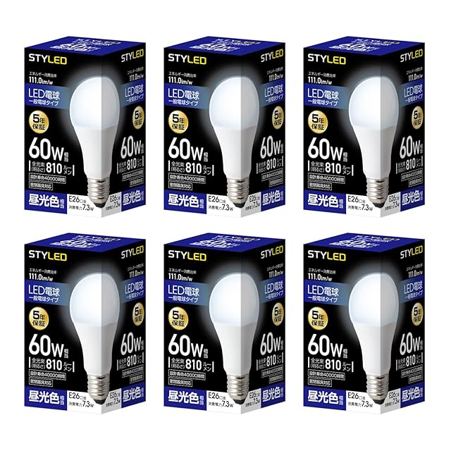 商品名:スタイルド LED電球 口金直径26mm 電球60W形相当 昼光色 7.3W 6個セット 一般電球・広配光タイプ 密閉器具対応 HA6T26D6