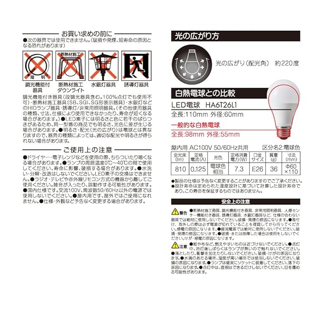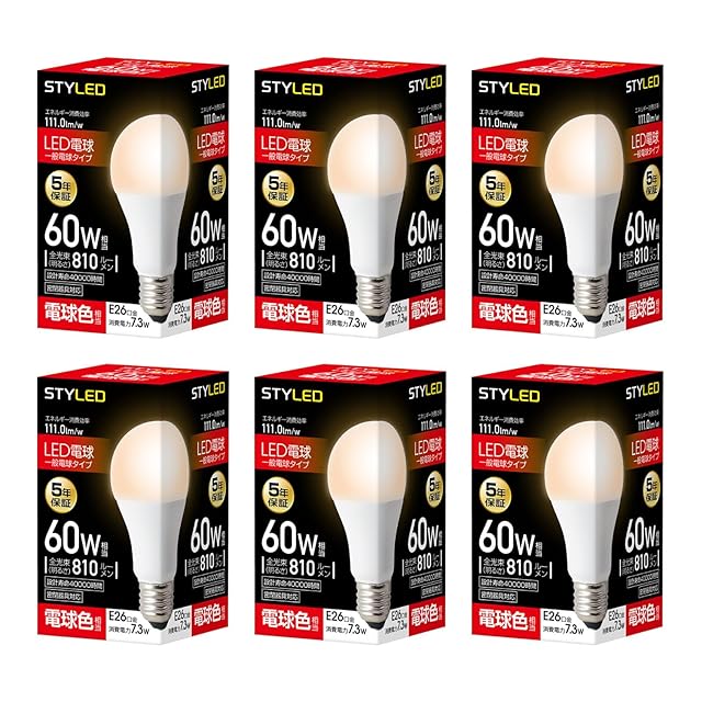 商品名:スタイルド LED電球 口金直径26mm 電球60W形相当 電球色 8W 6個セット 一般電球・広配光タイプ 密閉器具対応 HA6T26L6