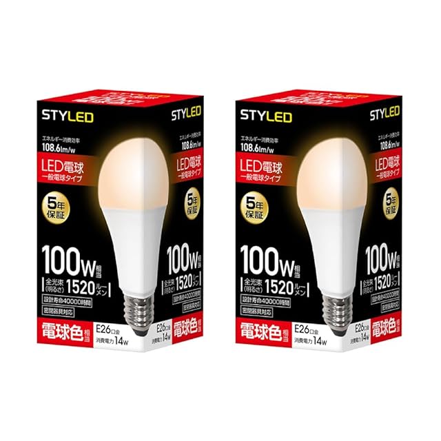 商品名:スタイルド LED電球 2個セット 一般電球タイプ 口金直径26mm 100W形相当 電球色 広配光タイプ 密閉器具対応 HA15T26LS2