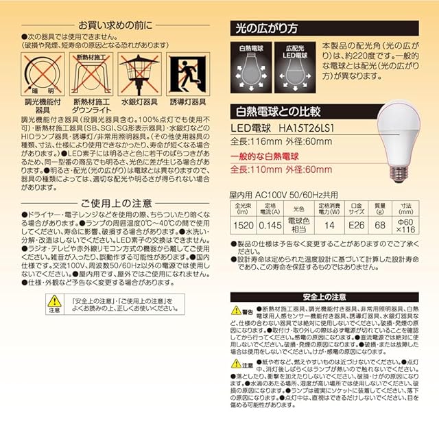 全光束:1520lm(電球100W相当)/消費電力:14W/消費効率108.6lm/W