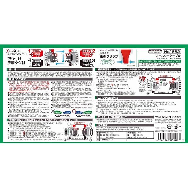 BAL(大橋産業) ブースターケーブル DC12V DC24V 100A 3.5m 軽自動車 コンパクトカー 普通乗用車 SUV ワンボックス トラクター 2tトラック HV ハイブリット車 救援端子 細型絶縁フルカバークリップ 取り付け手順タグ 品番:1682