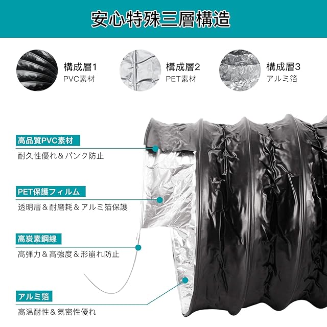 【気密性&難燃性】安心特殊三層構造+高強度鋼線を採用され、気密性と難燃性があり、丈夫で復元力がいい。普通のアルミホースと比べて、PVCダクトホースはUV耐性があり、耐久性がもっと優れます。伸縮や屈曲ができ、折り曲げてもつぶれたり、変形しにくい。