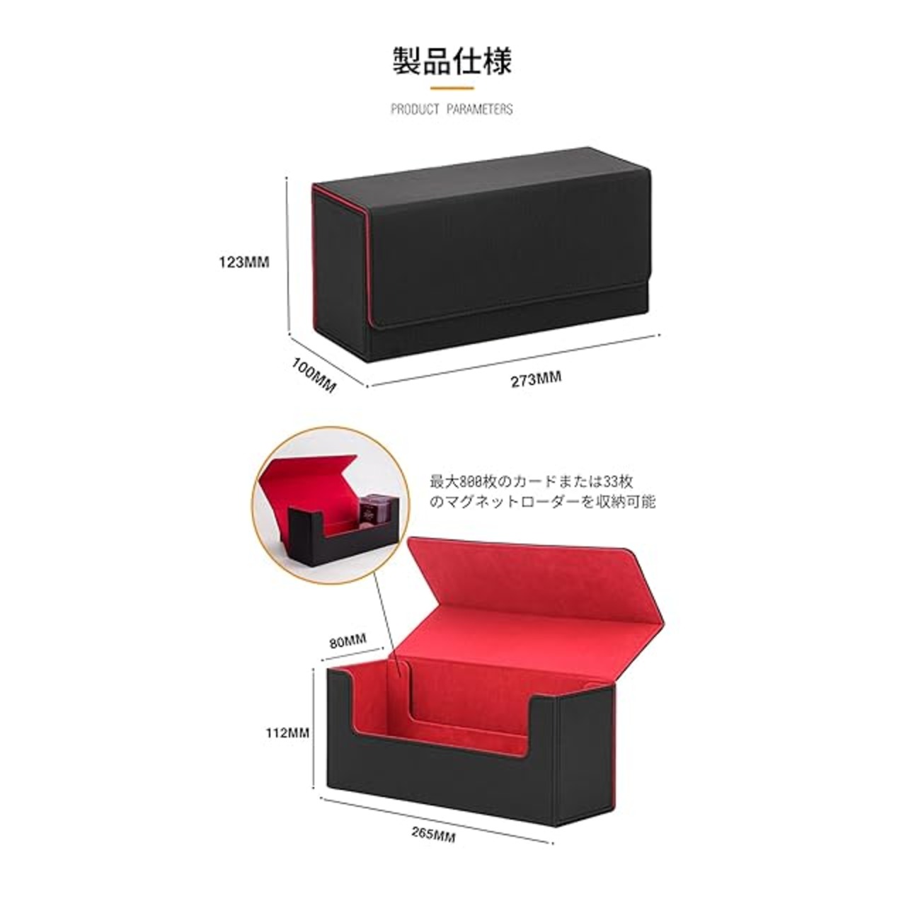 【製品仕様】デッキケース【外部サイズ】縦27.3cm 幅10cm 高さ12.3cm 【内部寸法】縦26.5 cm幅8 cm高さ11.2 cm 【材質】上質PUレザー 【重量】410 g 【収納枚数】最大800枚のカードまたは33枚のマグネットローダーを収納可能、市販されているほぼ全てのカードゲームに対応。 ・スタンダードサイズ63×88mm ・スモールサイズ59×86mm ・など様々なカードゲームに対応しております。