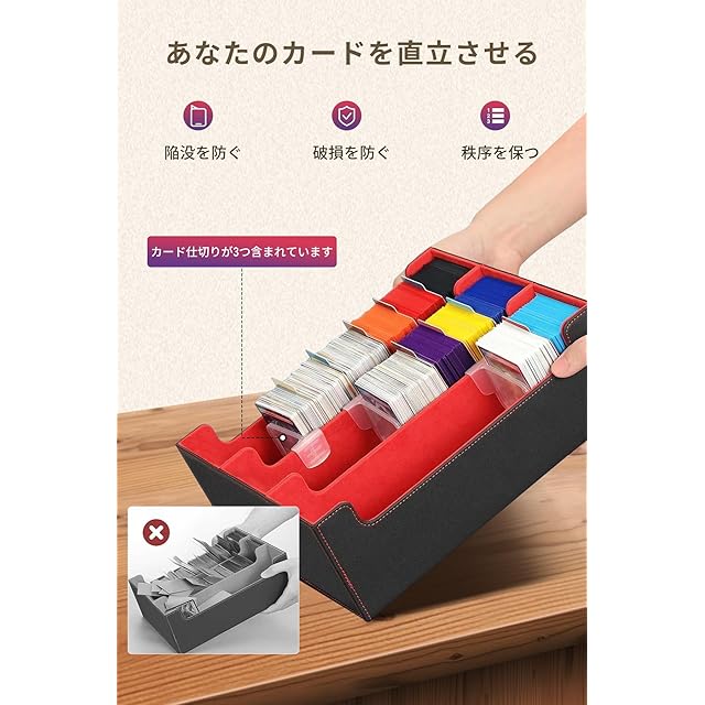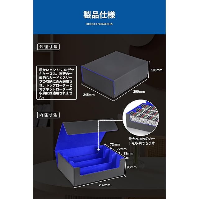 【製品仕様】デッキケース【外部サイズ】縦29cm 幅24.5cm 高さ10.5cm 【内部寸法】縦28.2 cm 幅7.2+7.2+7.2cm 高さ9.6 cm【材質】上質PUレザー 【重量】770g 【収納枚数】最大2400枚のカードを収納でき、 スリーブ付きのカードも簡単に入れることができる、市販されているほぼ全てのカードゲームに対応。 ・スタンダードサイズ63×88mm ・スモールサイズ59×86mm ・など様々なカードゲームに対応しております。暖かいヒント:このデッキケースは、市販の一般的なカードとスリーブの収納にのみ適用され、トップローダーとマグネットローダーの収納には適用されません。