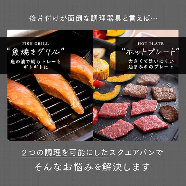 【取っ手が外せるから卓上での調理も】後片付けが面倒な調理器具ツートップと言えば、魚の油で網もトレーもギトギトになる「魚焼きグリル」と大きくて洗いにくい油まみれの「ホットプレート」。2つの調理を可能にしたスクエアパンでそんなお悩みを解決!ハンドルを取り外してホットプレートとしても使えます。手軽に食卓で熱々の料理を楽しめるので、ホットプレートは後片付けが大変だからと敬遠している方にもおすすめ。約26cm角の大きめサイズで大きな魚も切らずにそのまま焼くことが可能。デットスペースも少ないから効率良く調理ができます。底の凹凸と外周の溝が余分な油を落としてくれるので、ヘルシーな調理が可能。油が出やすい肉や魚料理もカリッと焼けます。