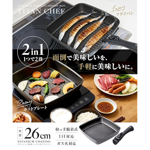 アイメディア(Aimedia) 魚焼きパン グリルパン フライパンセット 2点 (スクエアパン/専用脱着ハンドル) スクエアパン 26cm角 脱着ハンドル付 取っ手セット チタンシェフ ワイドサイズ IH対応 ガス火対応 オーブン対応 食洗機対応 着脱式取っ手 取っ手が取れる, シルバー