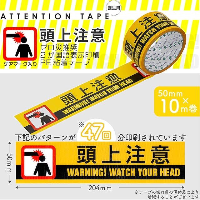 商品名:リンレイテープ 2か国語表示 印刷 養生テープ 50mm×10m 頭上注意 #625AT