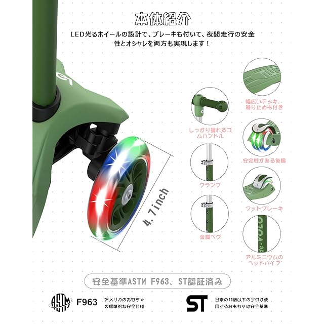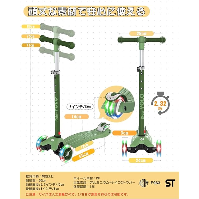 商品名:RideVOLO キックスクーター 子供向けキックボード キックスケーター 女の子 三輪車 三段階高さ調整 光るLEDタイヤ 耐荷重50kg アウトドアに適用 おもちゃ 安定 深い緑