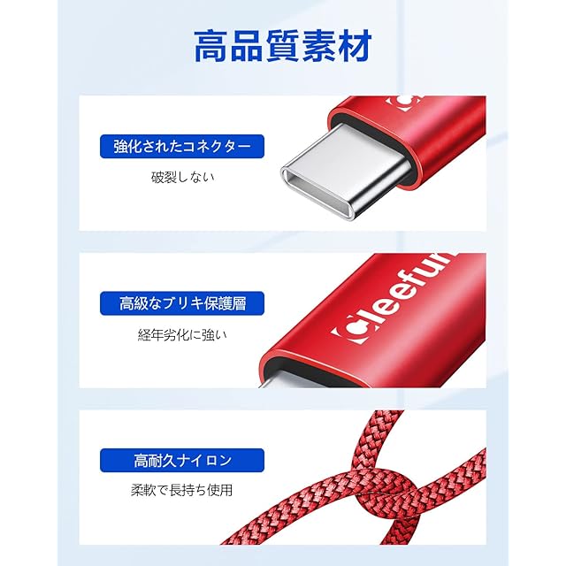 <b>CLEEFUN USB-A to USB-C 充電ケーブル </b><br> <b>【製品仕様】 </b><br> 素材: 頑丈なナイロンとアルミニウム合金<br> 色: レッド<br> 出力: 5V/3A<br> 長さ: 3M(2本セット)<br> データ転送: USB 2.0 (最 大伝送速度480Mbps)<br><br> <b>✔急速充電と安定なデータ同期 </b><br> QC3.0に対応し、最大電流3A通過支持です。且つ、USB 2.0基準で最大480Mbpsのデータ転送を対応します。<br> <b>✔高品質ケーブル </b><br> イスピードチップと56kΩレジスタを実装しており、短絡、過充電、発熱などのことを防ぎ、急速充電の安定と大切な機器の損傷防止を実現します。<br> <b>✔簡単に抜き差し </b><br> コネクタ部分はアルミニウム合金を採用して、10000回以上の抜き挿し試験に合格し、繰り返しても変形しません。<br> <b>✔しっかりしたつくり </b><br> 二重に編み込まれた軍事レベルのナイロンで、 高級感が溢れるだけでなくて、網組で保護されているので絡まりにくて、より耐久性があります。<br><br> <b>【幅広い対応】 </b><br><br> 主な対応機種(USB-Cポートのスマホ)<br> - Xperia 10 XZ Premium XZ1 XZ2 XZ3 XZ2 Premium XZ1 Compact/ Xperia XA1 XA2 Ultra<br> - Galaxy S20 /S10 /S10+ /S10e /S8 /S9 /S8+ /S9+ /Note 8 /Note 9 /Note 10 /Note 10+/Note 20<br> - Galaxy A7 /A8 /A8s /A8+/A9/A9S/A20 /A20e /A20s /A21 /A21s /A30 /A32 /A41/A51/M20 /M21 /M30 /M31<br> - Moto G6/G7/G8/G7 Power/G8 Power/G7 Play/G6 Plus/G Pro/G Power 2021/Moto Z/E32/E32S/Z Play/Z2 Play /Z3/Z3 Play<br> - Xiaomi Mi A1 /Mi Mix 2 /Mi Mix 2s /Mi Max 3/Mi 6/Mi 5/Mi 5s/Mi 5s Plus/Mi 8 Lite/Mi 8 SE<br> - Xiaomi Redmi Note8 /Note8 Pro /Note9 /Note10 Lite/Redmi 9/9T<br> - Huawei P10/P20/P20 Pro, Mate 9/9 Pro/10/10 Pro/20/20 Pro, Nova 2/3/4 <br> - LG G5 G6 G7 One G7 Fit G8 ThinQ V30+ V30 V20 V35 ThinQ Stylo4<br> - OnePlus 2/3/3T/5/5T/6/6T/7/7 Pro<br> - Honor 8/8 Pro/9/10/View 10/V20<br> <br> 主な対応機種(他のUSB-Cポートのデバイス)<br> -Galaxy Tab A 10.5/Tab S3 9.7/Tab S4 10.5<br>-HuaweiMateBook<br> -Chromebook / Pixel C / Pixel/Pixel XL<br> -Switch<br> -および他のUSB 2.0 / 3.0 USB-C端子が搭載される機器に対応しております。<br><br> <b>ご注意: </b><br> 充電速度は出力側(ACアダプタ&PCのUSBポート等)及び入力側(スマートフォン、タブレット、モバイルバッテリー等)の組み合わせにより変化いたします。急速充電できない場合あります。