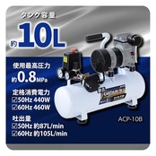 使用最高圧力:約0.8MPa(8.2kgf/cm2)、安全弁設定圧力:約0.88MPa(9.0kgf/cm2)、リリース起動圧力:約0.5MPa(5.1kgf/cm2)、吐出圧力設定範囲:約0~0.8MPa(0~8.2kgf/cm2)、充填時間:50Hz 約3分・60Hz 約2.5分、接続(吐出)口:ワンタッチソケット1/4、タンク容量:約10L、騒音値:約70dB/m