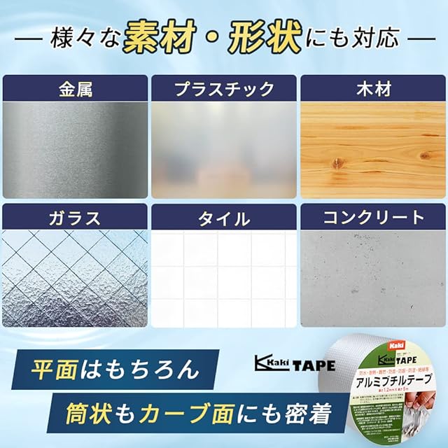 カキテープのアルミブチルテープ。特殊加工により防水・耐熱・難燃・防音・防振・防湿・絶縁等、性能に優れていますので、様々なシーンでご利用いただけます。幅5cm、10cm、15cmの3サイズをご用意しています。