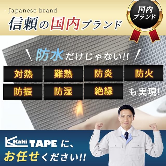 カキテープのアルミブチルテープ。特殊加工により防水・耐熱・難燃・防音・防振・防湿・絶縁等、性能に優れていますので、様々なシーンでご利用いただけます。幅5cm、10cm、15cmの3サイズをご用意しています。