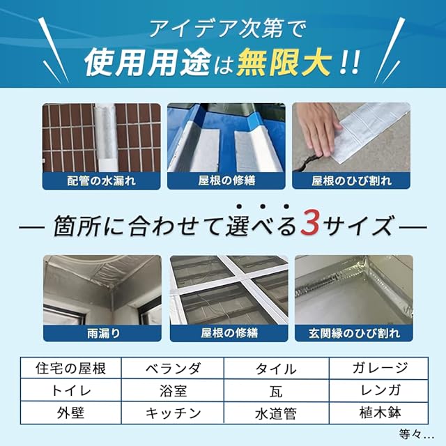 屋根やガラスの修繕以外にも、破れた布や金属やプラスチック、木材、など様々素材での使用可能。