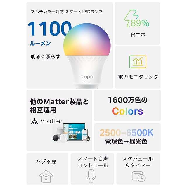 商品名:TP-Link Matter対応 LED電球 1100ルーメン 1600万色 スケジュール&タイマー 【Alexa/Siri/Google アシスタント 対応】Tapo L535E/A 1-pack
