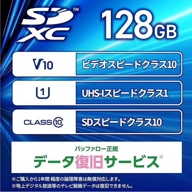 商品名:バッファロー SDカード 128GB 100MB/s UHS-1 スピードクラス1 VideoSpeedClass10 IPX7 Full HD データ復旧サービス対応 RSDC-128U11HA/N