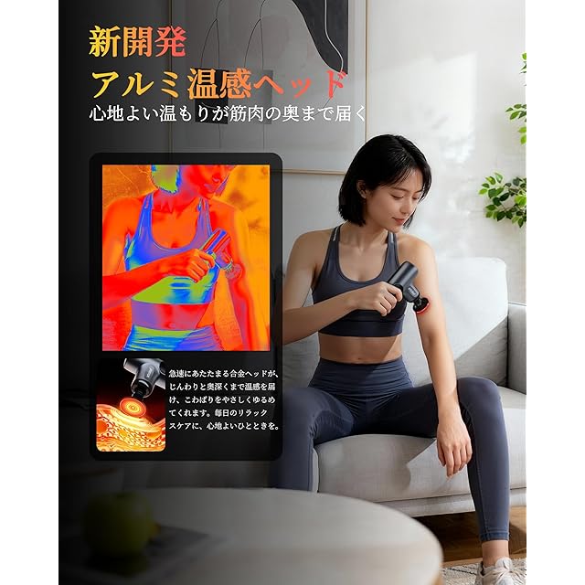 「アルミ合金製温感ヘッド搭載–本体から直接給電」導熱性に優れたアルミ合金ヘッドは、わずか5秒で素早く均一に加熱。45℃±3℃の温度調節に対応しております。別途充電の必要がなく、本体から直接電源供給するため、安定した温度をキープ。力と温もりを同時に体感でき、振動と温熱が深部まで届いて筋肉をしっかりほぐし、快適にリラックス。短時間でパワフルな温感ケアを実感できます。さらに、4種類のアタッチメントが付属しており、用途に応じて簡単に交換して使えます。