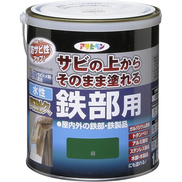アサヒペン 塗料 ペンキ 水性高耐久鉄部用 1.6L 緑 水性 サビの上からそのまま塗れる ツヤあり 低臭 サビドメ剤配合 特殊フッ素樹脂配合 紫外線劣化防止剤配合 日本製