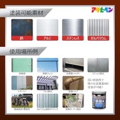 用途:(屋内外区分:屋内外用)扉、フェンス、シャッター、パイプ、機械器具、農機具など屋内外の鉄部・鉄製品。ガルバリウム・トタン・アルミ・ステンレスの製品(屋根は除く)・木製品。※食器などの直接食品が触れるような箇所や、常時水につかるところ、車のマフラーなどの耐熱性が必要なところ、自動車・バイクの補修、床面、テーブルの天面、常に衣服が接触するイス等には適しません。