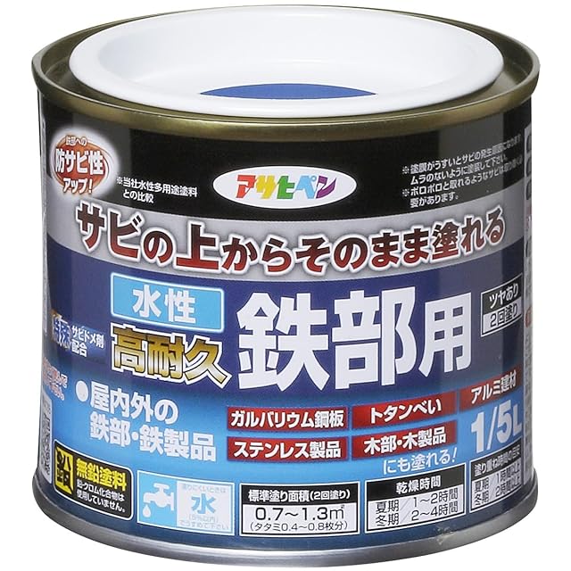 アサヒペン 塗料 ペンキ 水性高耐久鉄部用 1/5L 青 水性 サビの上からそのまま塗れる ツヤあり 低臭 サビドメ剤配合 特殊フッ素樹脂配合 紫外線劣化防止剤配合 日本製