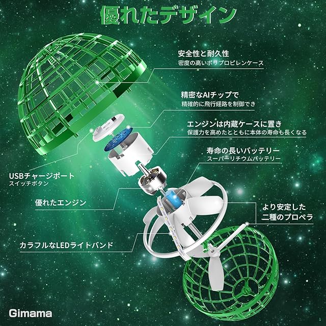【優れた材料と独特なデザインの両立】耐久性を高めるため優れたポリプロピレンを採用され、無毒無害で柔らかくて耐衝撃材料である。軽く柔軟性のある作りなので落ちても壊れない。コントローラーを使用せず、赤外線で四方を感知して自動で飛んでくれるフライングボールであり、手を近づけたり、壁に近づいたら反対方向へ飛んでくれるので簡単に飛ばせて遊べる。中央のLEDが色を変えて点滅し綺麗で、夜に遊びるとアステロイドのような輝いているフライングボールは手中で回転する。
